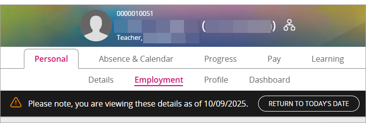 When changing the date, the system displays the organisation as per the selected date. A black warning bar is displayed if you are viewing the organisation chart for a previous date: