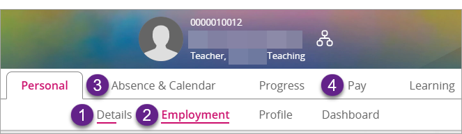 An employee's information is stored within a variety of different tabs / sub-tabs within their employee record: