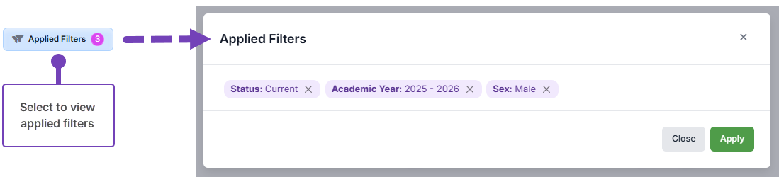 To view a summary of filters selected, select Applied Filters: