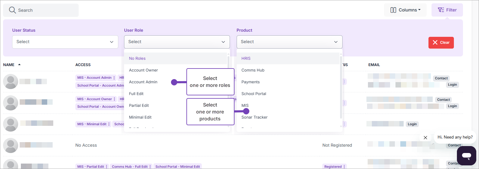 Select one or more User Roles and Products to view those users with corresponding roles for the selected products:
