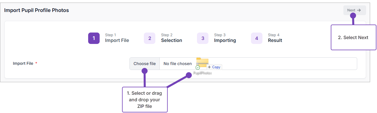 This article explains how to import one or more pupil profile photographs (PNGs or JPEGs) in bulk using a ZIP file,the contents of which are automatically assigned to the appropriate pupil using their Unique Pupil Number (UPN). Using this approach will save you considerable time when adding pupil photographs to pupil records.