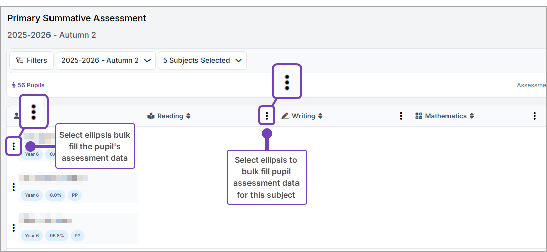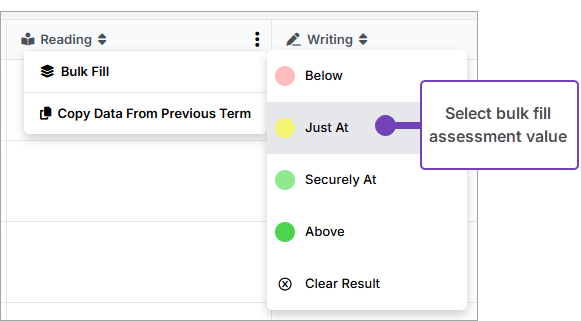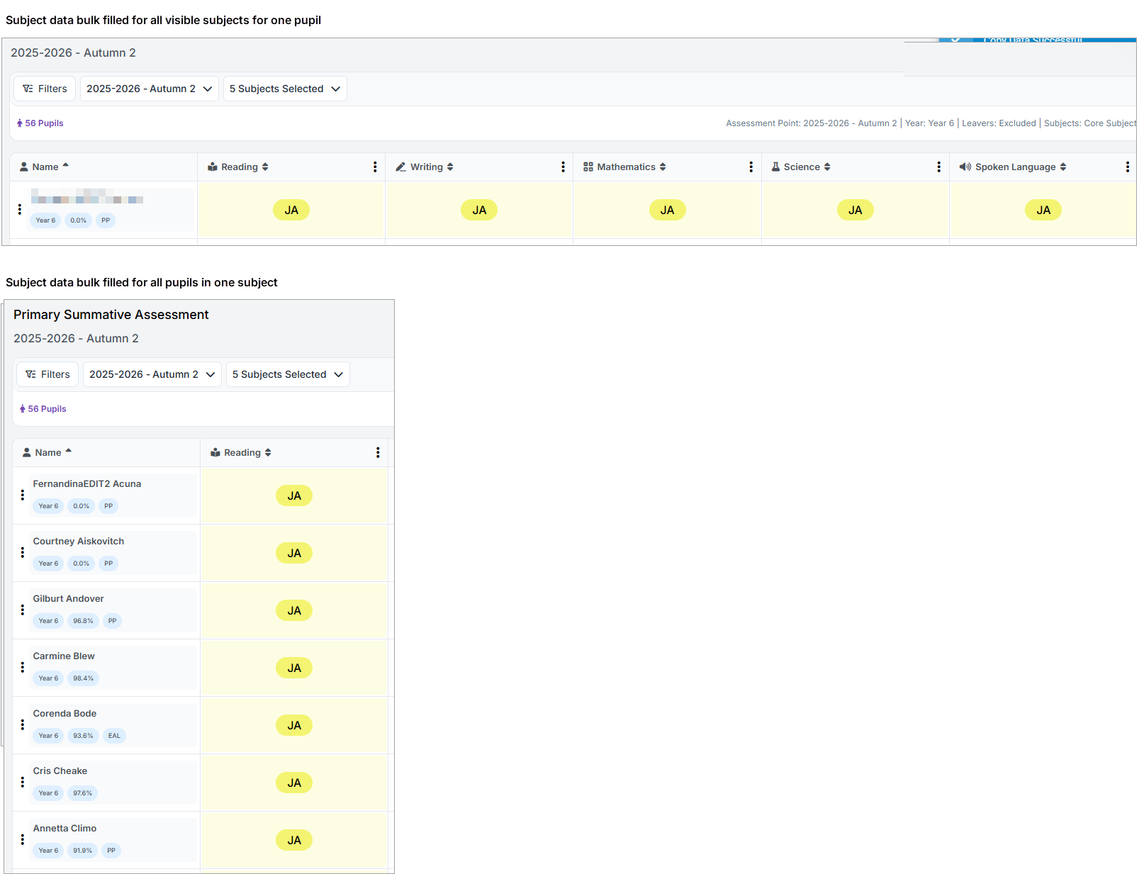 Bulk filling speeds up data entry. After you've completed a bulk-fill, manually adjust any outliers in subjects or pupil assessments.