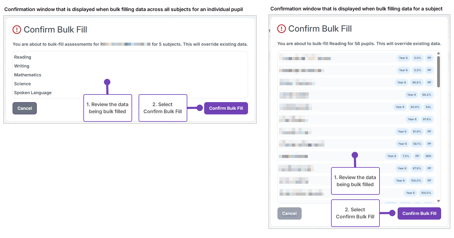 Take care when using this feature. Existing data for the selected pupil(s)/subject(s) will be replaced with the value used for the bulk fill. Once the action is completed, you cannot undo the changes - you will need to manually restore the data to its previous state.
