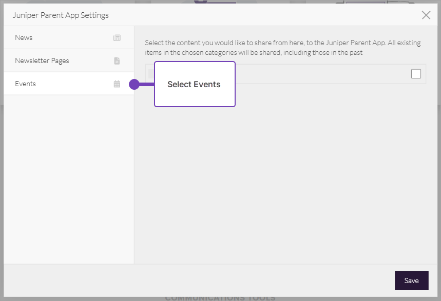 1. Check one or more event calendars to publish to the Juniper App, for example, as shown above, School Events.