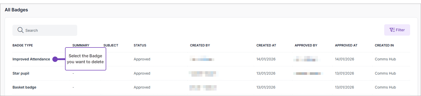 - Locate the badge you want to delete using search or the status filter (set to Approved) as needed.
