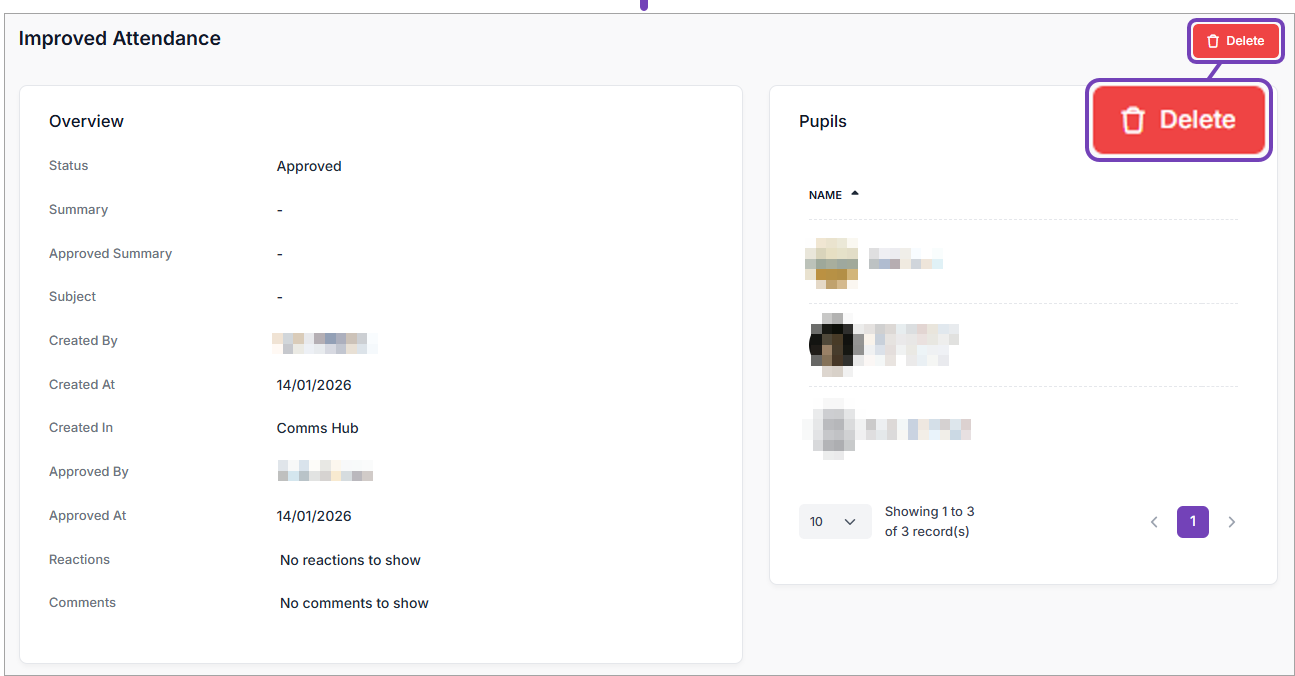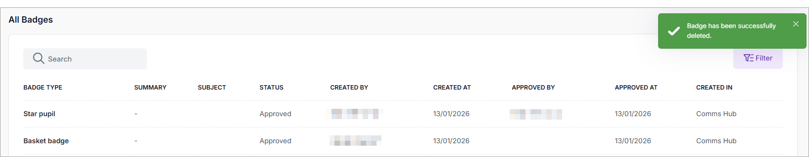 You can only delete a badge that has been approved. A badge Pending Approval or that has been Declined cannot be deleted. If a badge is awarded to multiple pupils at once, deleting the badge will remove it from all pupils (you cannot delete it for a subset of pupils to whom it was awarded).