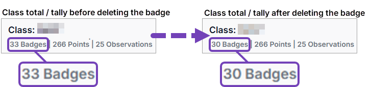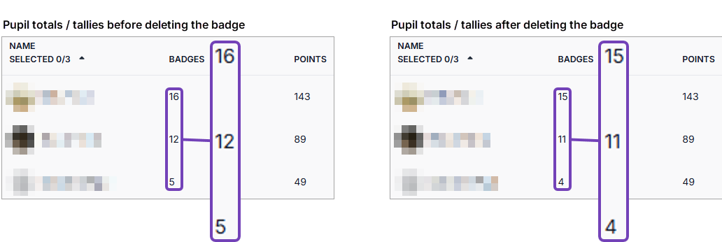 In the example below, three pupils were awarded a badge. For each pupil, the badge is removed from each of their individual badge tallies / totals, and 3 badges are removed from their class tally / total after the deletion. This deduction, although not shown below, is also made to their year group badge tally / total.