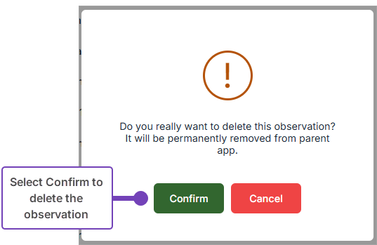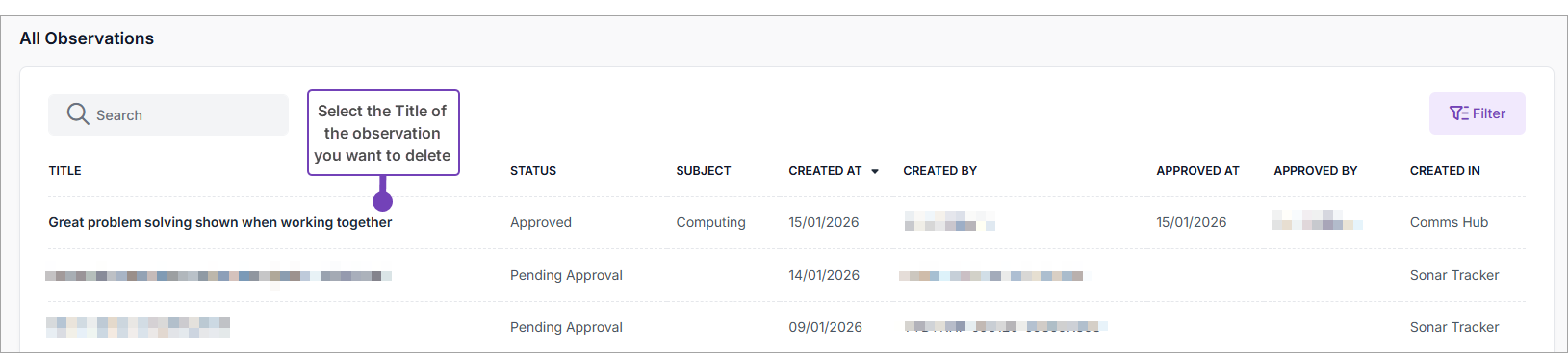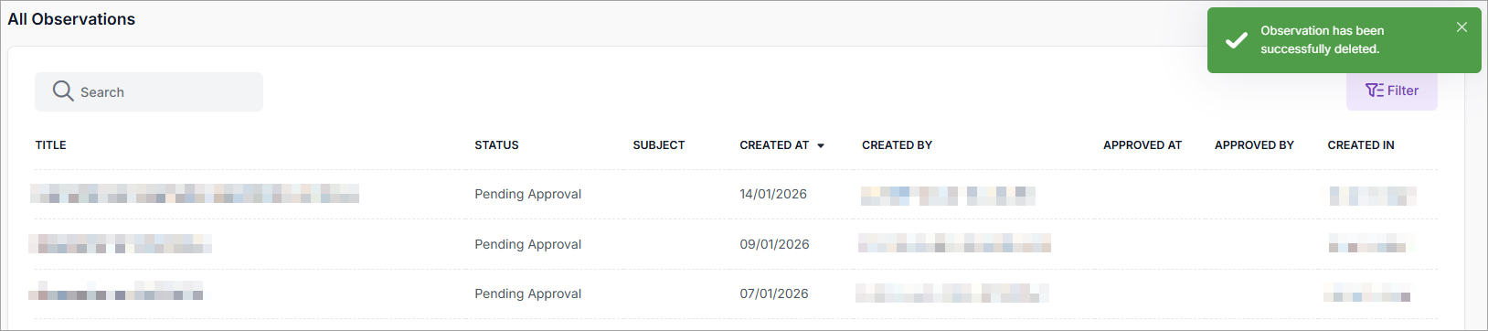 - Locate the observation that you want to delete using search or the status filter (set to Approved) as needed.
