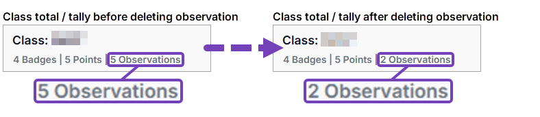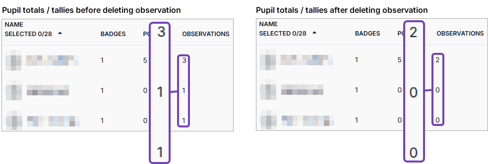 In the example below, three pupils had been observed in one informal observation. For each pupil, the observation is removed from each of their individual observation tallies / totals, and 3 observations are removed from their class tally / total after the deletion. This deduction, although not shown below, is also made to their year group observation tally / total.