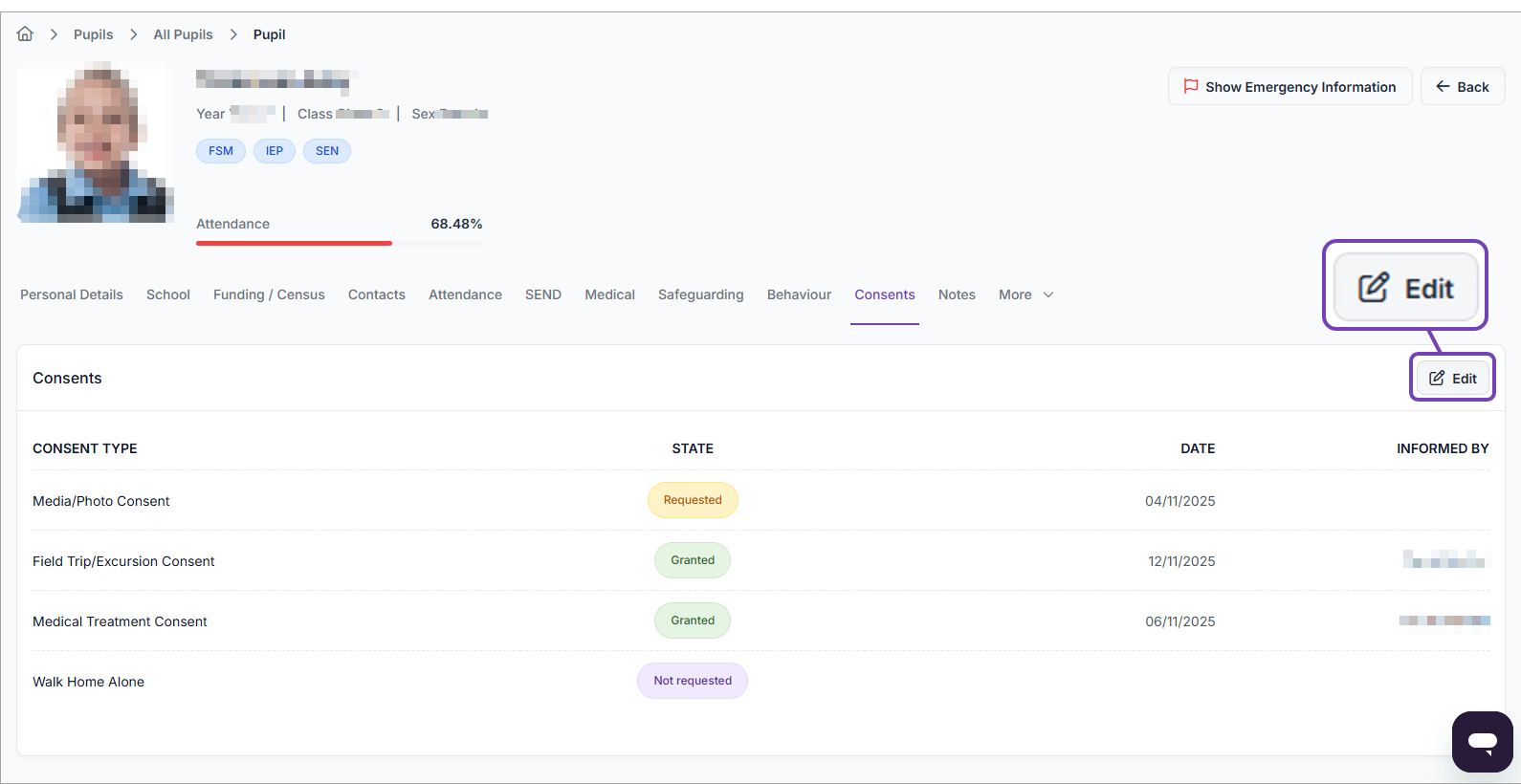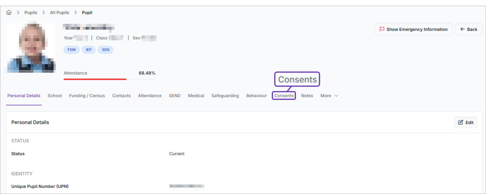 This article explains how to add / edit / remove parent consents for an individual pupil from within their pupil record.