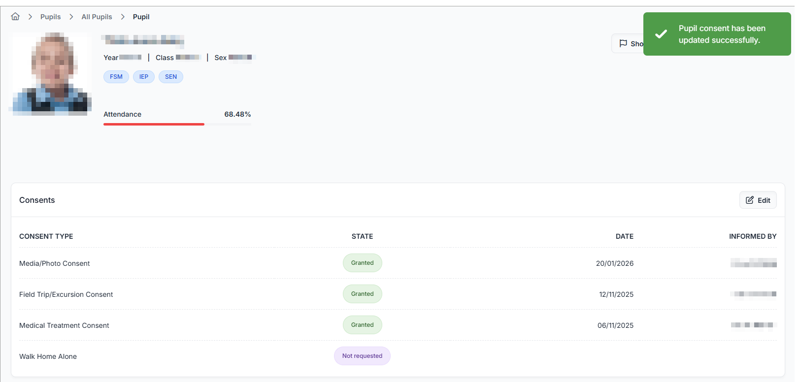 The parental consent for the pupil will be updated on the pupil record with the changes that you have made: