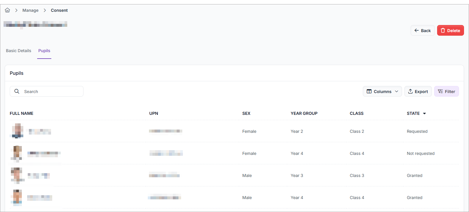 To view a list of pupils and the status of their associated parental consents, select Pupils:
