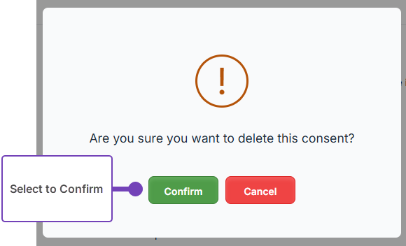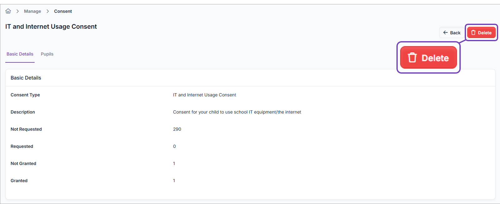 Only delete Consent Types that are no longer required. It is not possible to reverse the deletion of a Consent Type. When you delete a Consent Type, and references to it, for example, in a pupil record, are removed across the system.