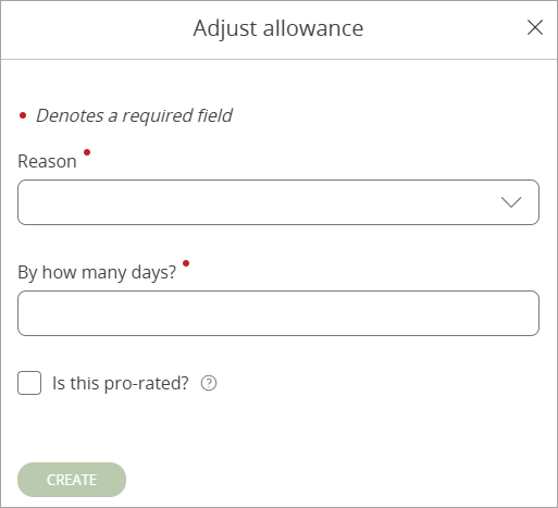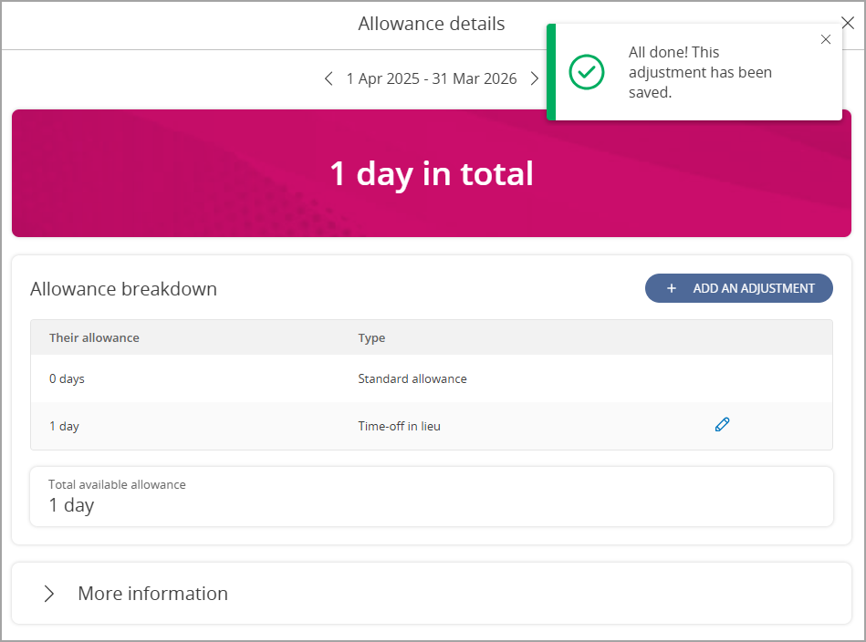 - Select the Reason for the adjustment from Carried forward, Discretionary, Holiday bought, Holiday sold and Time-off in lieu.