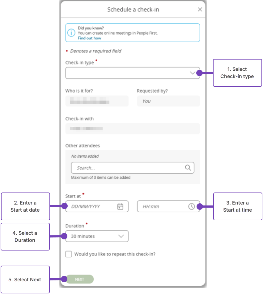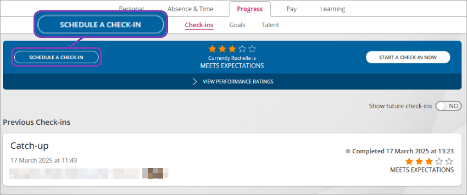 • You can only schedule check-ins with those employees who report to you (you must be their line manager in the Org Chart).