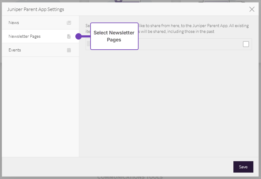 1. Check one or more newsletter pages to publish to the Juniper App, for example, as shown above, Newsletters.