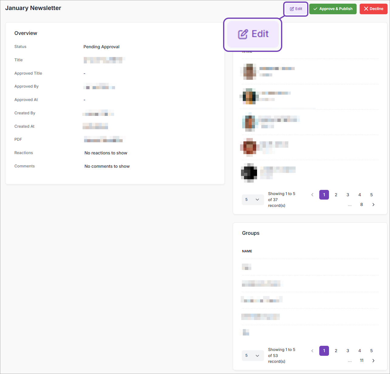You can only edit a newsletter that has a status of Pending Approval and was created in the current Academic Year. Approved or Declined newsletters cannot be edited.