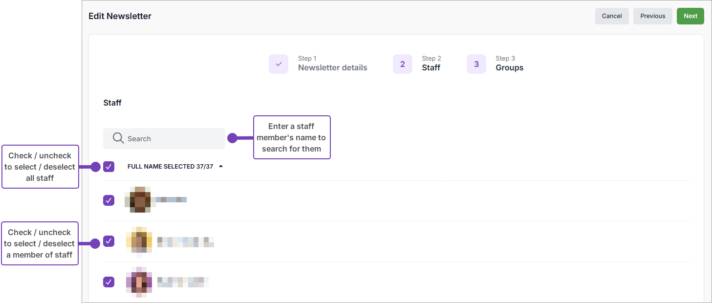 1. Uncheck the select all checkbox if you don't want to send to all staff members. By default, all staff members are selected as recipients of the newsletter.