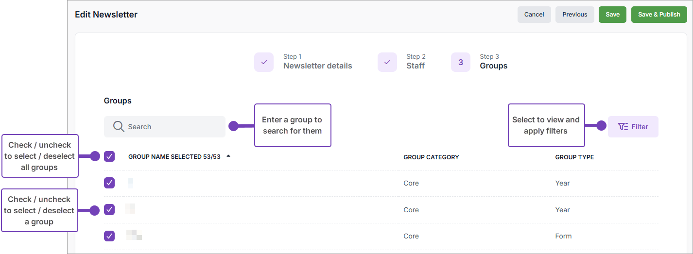 1. Uncheck the select all checkbox if you don't want to send to all groups. By default, all groups are selected as recipients of the newsletter.