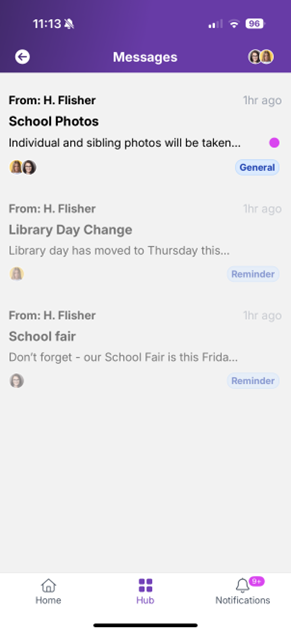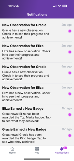 The Notifications list shows all push notifications sent to the parent. The purple dot indicates that the notification has not been opened. App messages Messages lists any messages that you have sent to parents. Parents can open each message to view its content. Additionally, they can long-hold the message to react using an emoji.