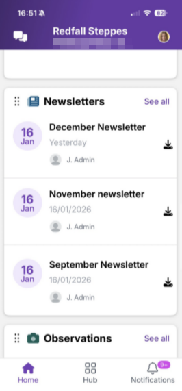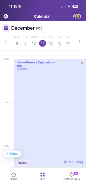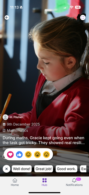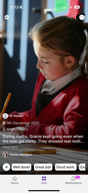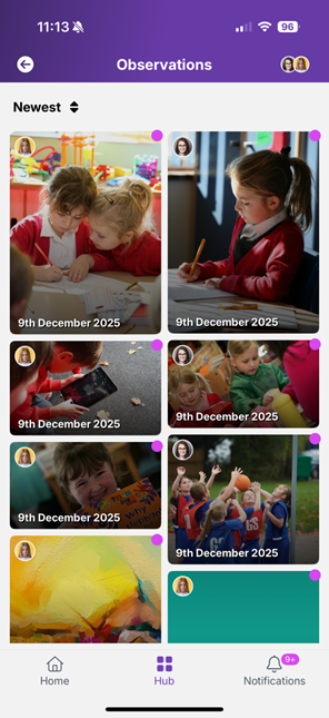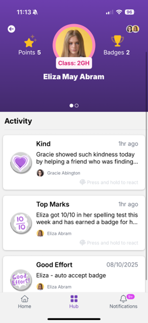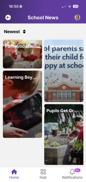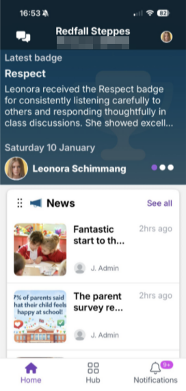 Home screen Hub (menu) Notifications The Home screen is a mixed feed, segmented by the type of content shared with parents.