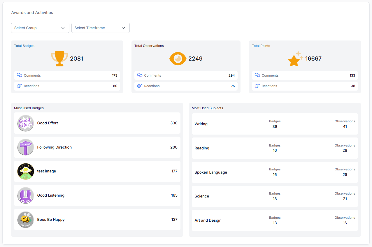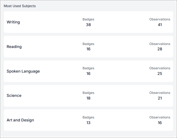 The Most Used Subjects section in the Awards and Activities widget displays the total Badges and Observations awarded for the five highest ranking subjects, for the selected time period and group, or the default values if unchanged. The subjects are sorted in descending order based on the combined total Badges and Observations for the subject: