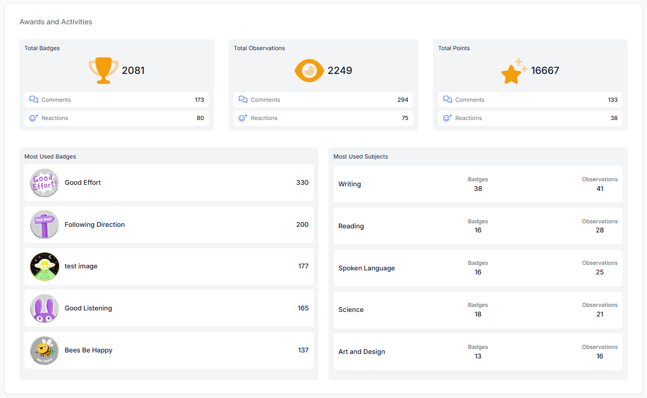 The Most Used Subjects section in the Awards and Activities widget displays the total Badges and Observations awarded for the five highest ranking subjects, for the selected time period and group, or the default values if unchanged. The subjects are sorted in descending order based on the combined total Badges and Observations for the subject: