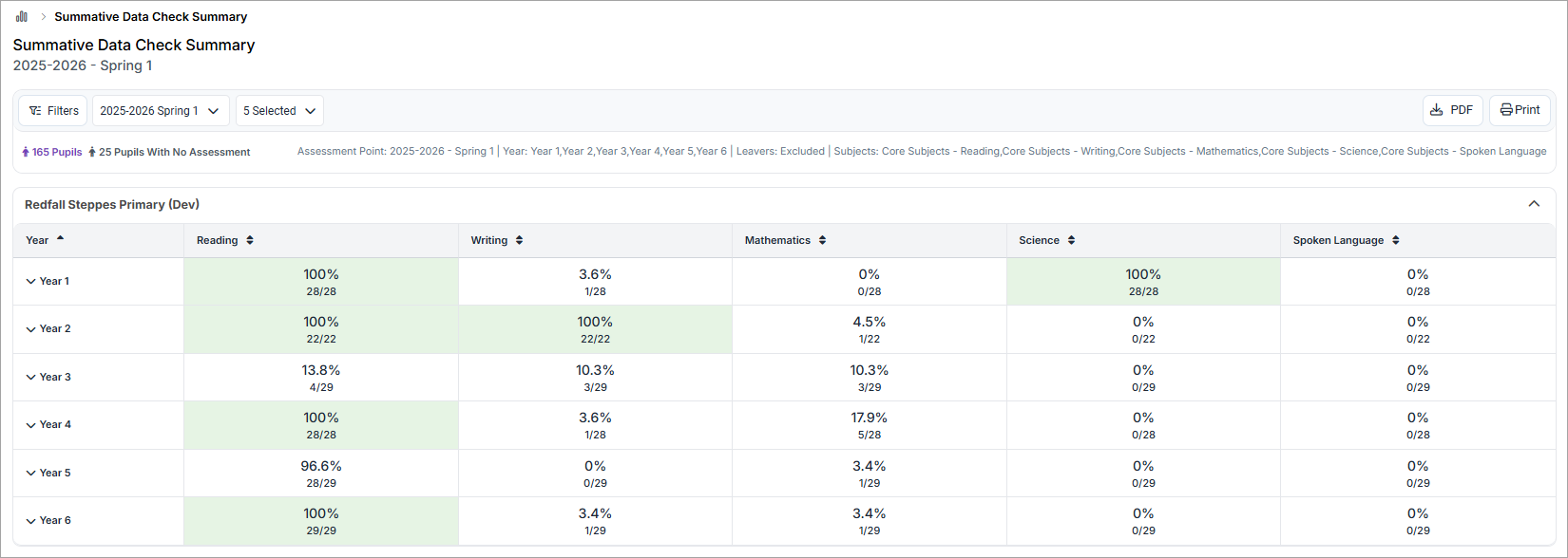 Each cell in the report shows the number and percentage of completed summative assessments compared to those expected:
