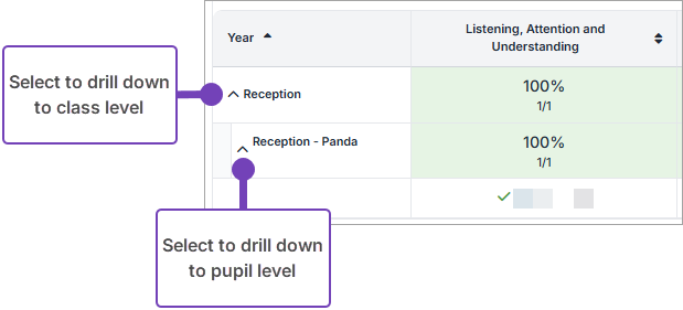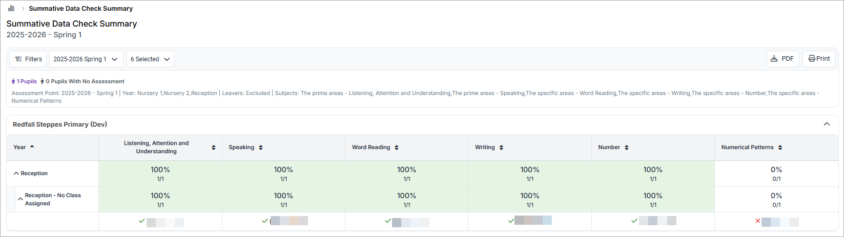 - Rapidly identify gaps at a year group, class, or individual pupil level where EYFS summative assessments have not been completed, allowing you to follow up with staff as needed.
