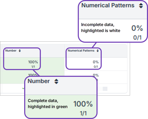 Each cell in the report shows the number and percentage of completed summative assessments compared to those expected. Where data entry is not 100% complete, the cell is white. Where data entry is 100% complete, the cell background is highlighted green. |