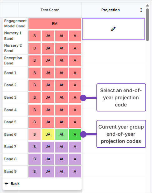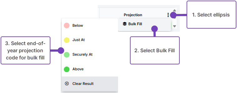 To save time, bulk fill end of year projection codes for multiple pupils and manually overwrite the outliers. To do this, selecting the ellipsis next to Projection, select Bulk Fill, then select the end of year projection code you want to assign to all pupils: