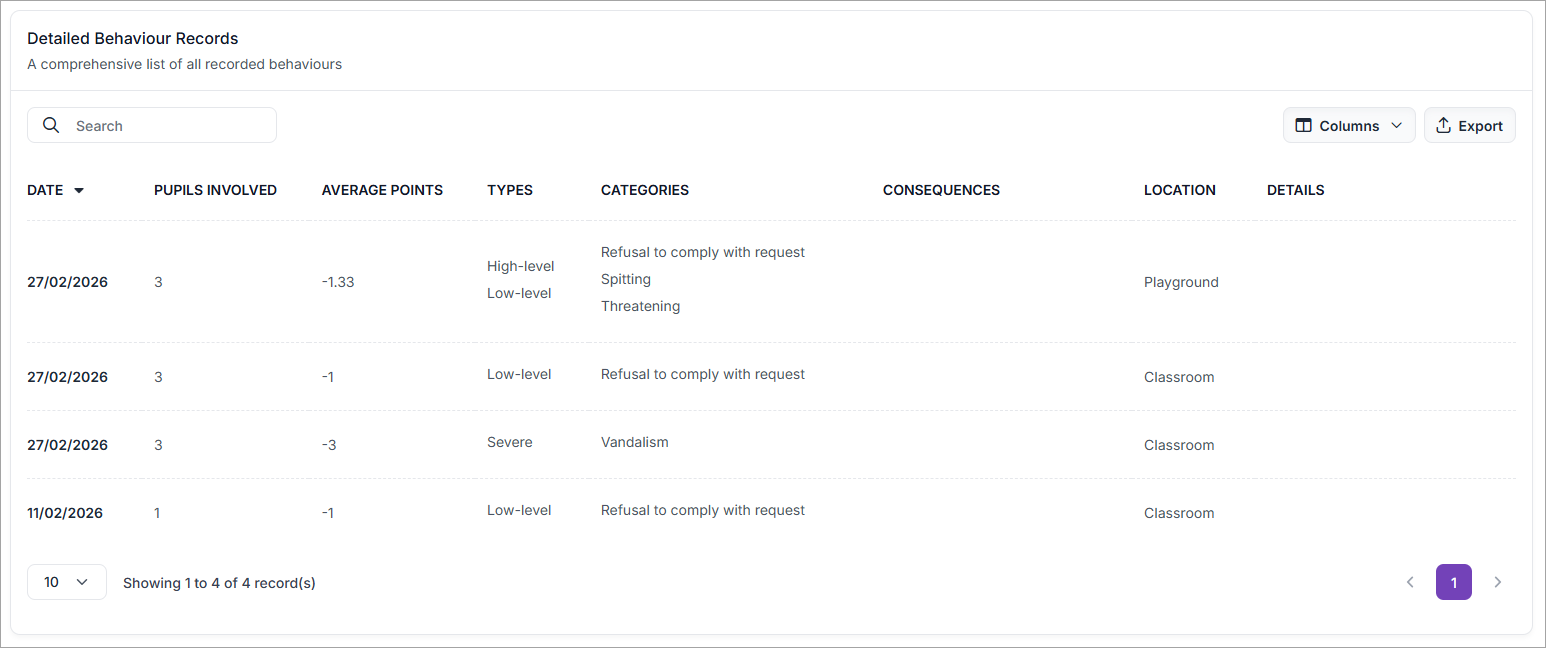 To open the Behaviour Report and export a list of all recorded behaviour incidents: