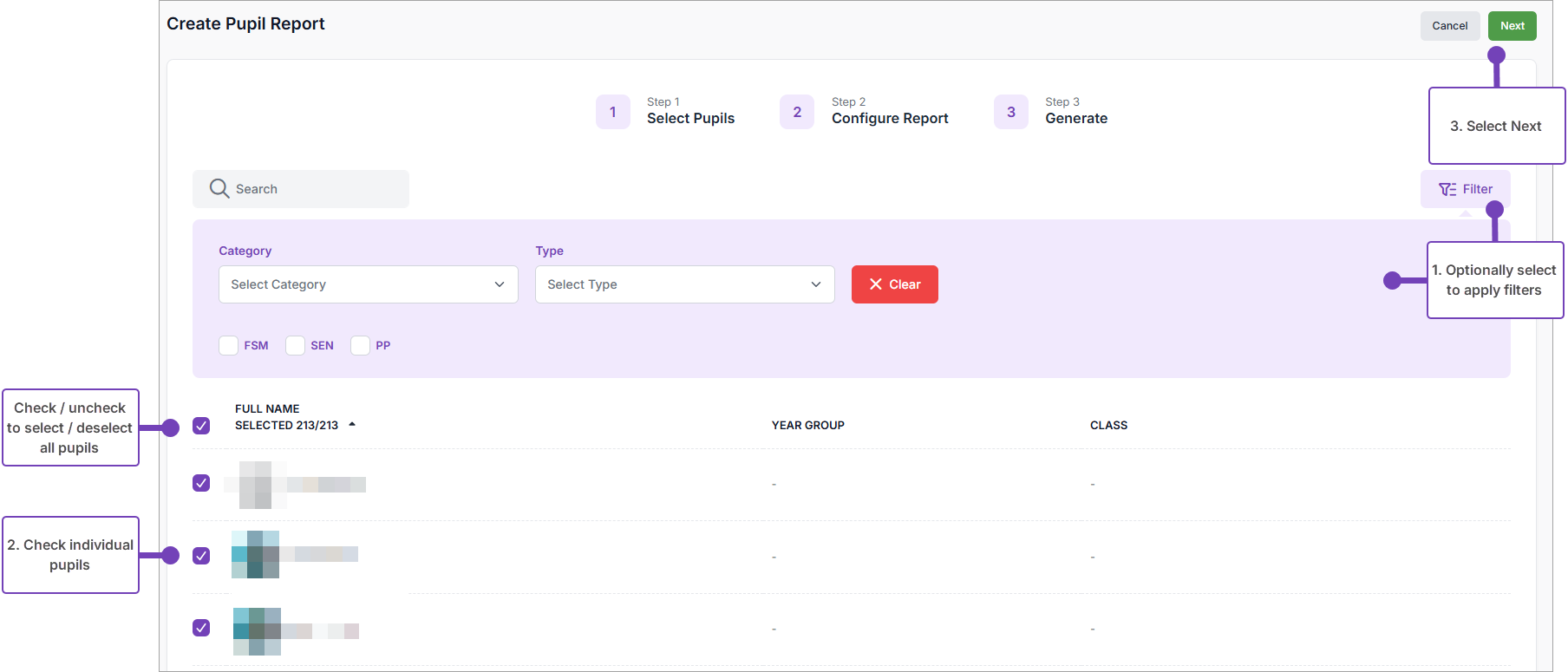 2. Check the names of the pupils you want to include in the report (check the box next to Full Name, to select all pupils)