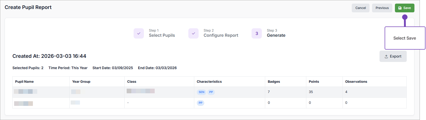 Depending upon your selections, a report is generated listing pupils along with their total points, badges and observations over time. The report is saved and you are returned to Pupil Reports. A message is displayed confirming that the report is saved.