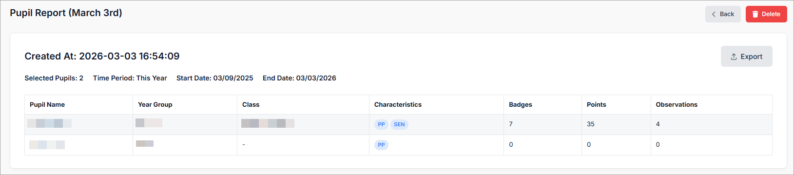 This article explains how to create a Pupil Report in Awards & Activities to view filtered and segmented data on pupil achievement and engagement for a selected date range. The report displays each pupil's year group, class, characteristics, number of badges, points awarded, and informal observations recorded.