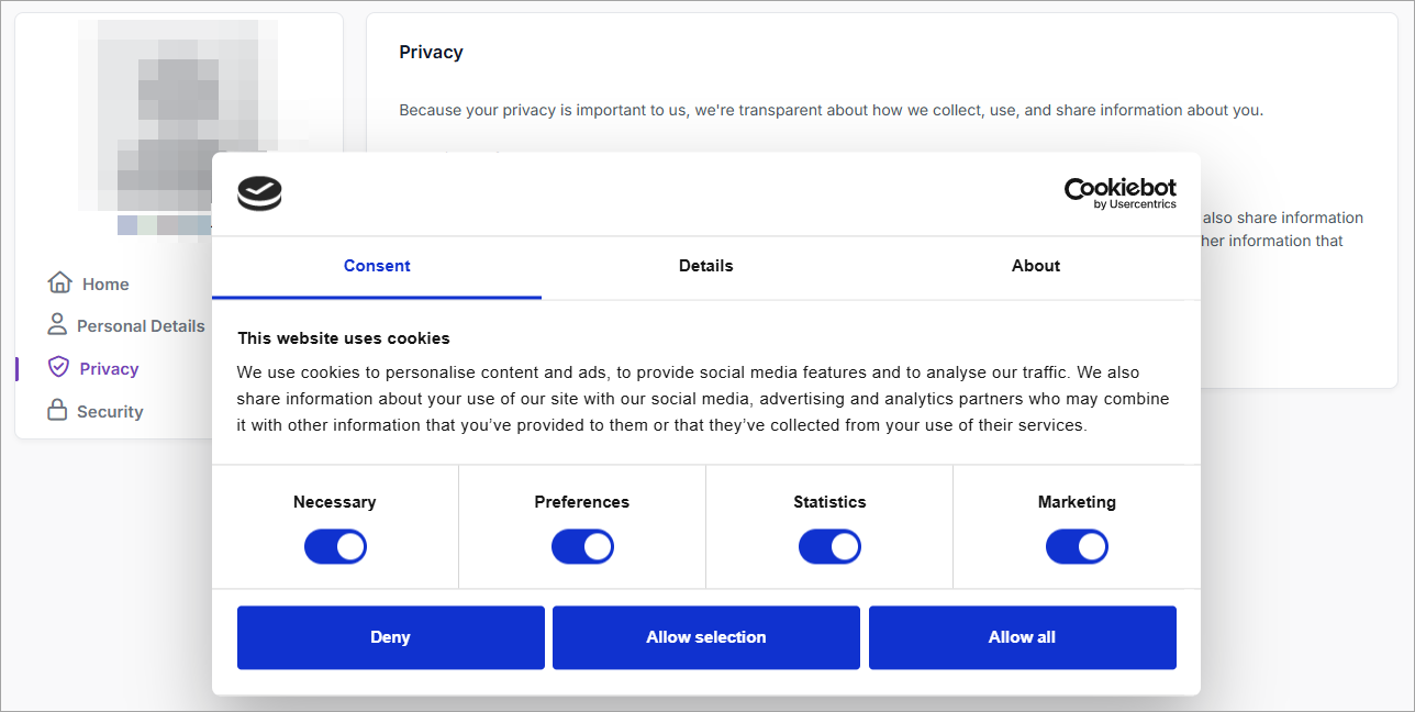 Update your cookie preferences using the toggles in the Cookiebot window, then select the appropriate button to save the changes:
