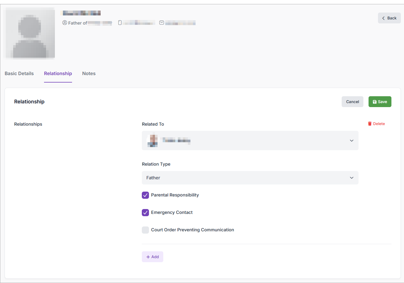 - To add a new relationship, select Add and then complete the relationship details.