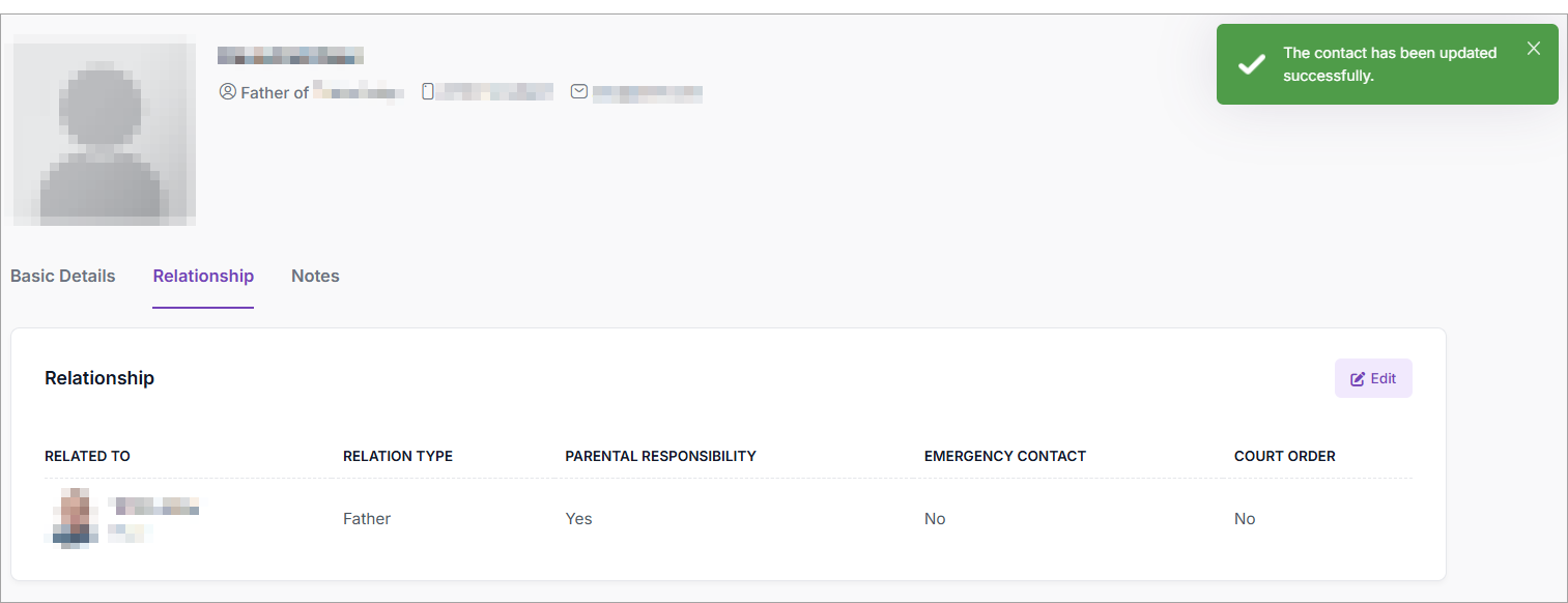 - To edit a relationship, modify the Relation Type from the list and check Emergency Contact as required.