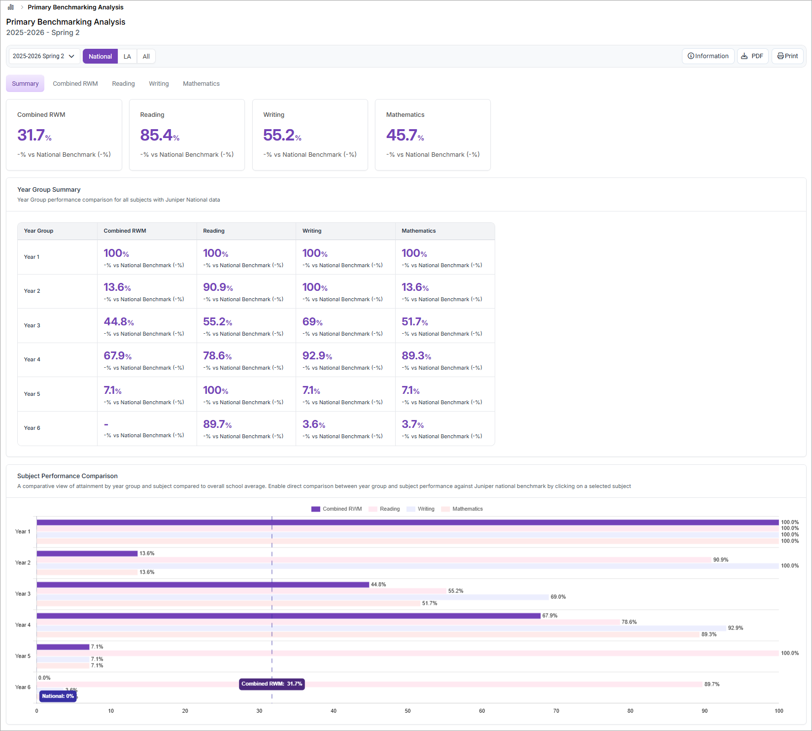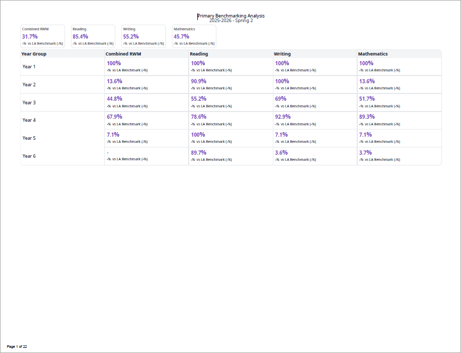 Primary Benchmarking Analysis lets schools compare teacher assessment data with results from other schools using Sonar Tracker within their Local Authority (LA) and nationally. This helps school leaders understand how their school’s performance compares to wider benchmarks and provides external validation of attainment data.