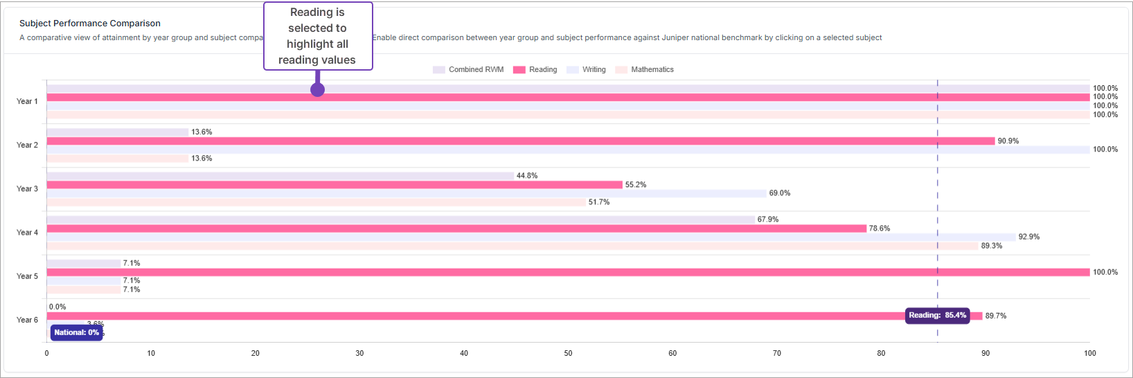 Select a bar within a bar chart to highlight that set of values within the chart and display the National and LA averages (based on Filter selection) for the Year Group (individual subject displayed) or Subject (where Combined RWM is displayed), for example, the Reading values in the Summary Report across all year groups: