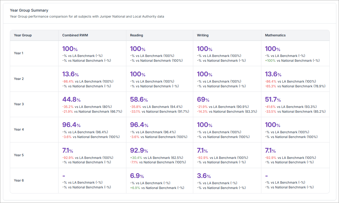 3. Green positive percentages indicate better performance than the benchmark average for the specific subject for the specific Year Group.
