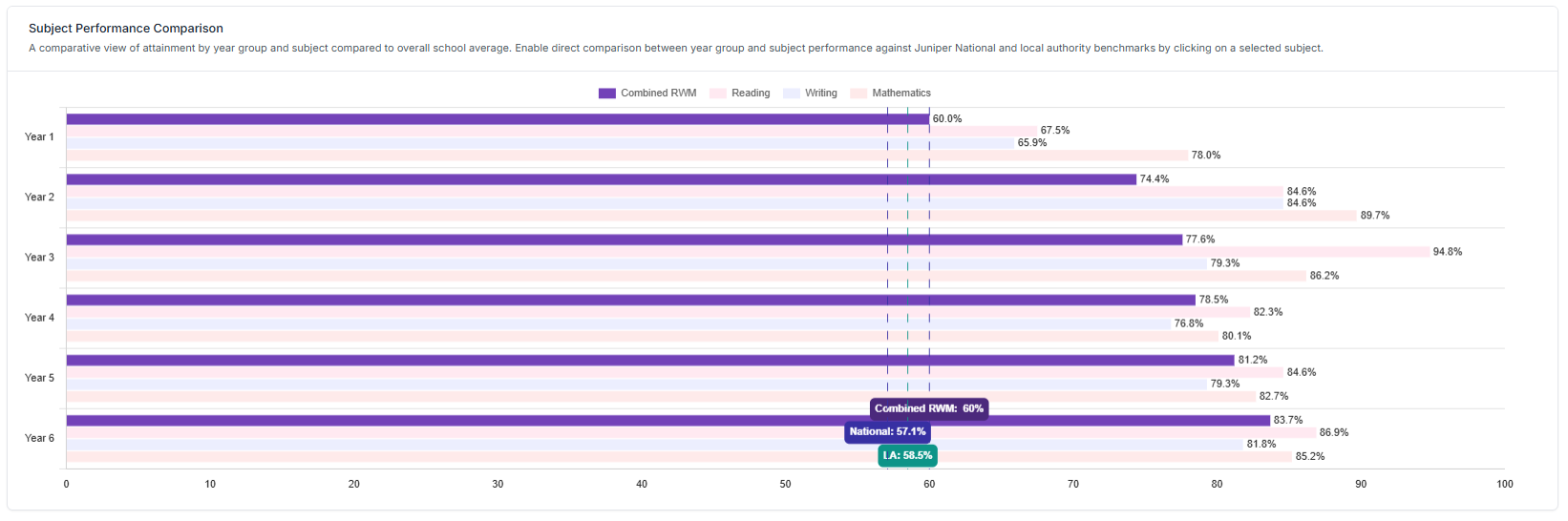 Split into Key Stage 1 and Key Stage 2, use this table to compare your school subject level performance with Juniper National and Juniper Local Authority data by contextual group: