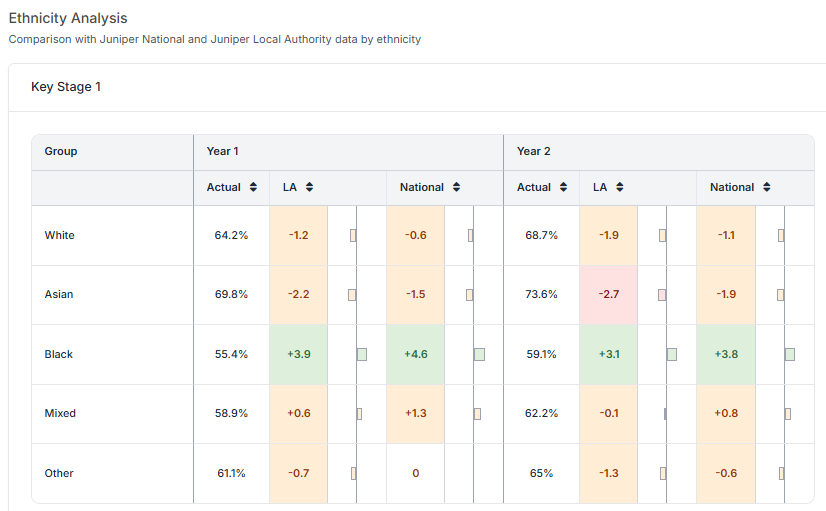 Split into Key Stage 1 and Key Stage 2, use this table to compare your school subject level performance with Juniper National and Juniper Local Authority data by ethnicity group.