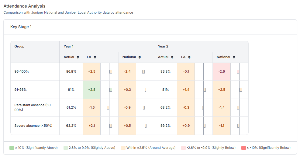 Split into Key Stage 1 and Key Stage 2, use this table to compare your school subject level performance by attendance band with comparative data from the Juniper National and Juniper Local Authority benchmarks for the same attendance band.