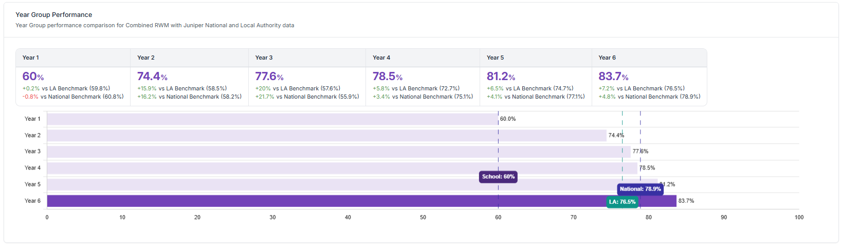 The Combined RWM National and Local Averages are shown for as an average of all Year Groups by default. Select a Year Group to display the year specific averages Nationally and at a Local Authority level along with the school average.