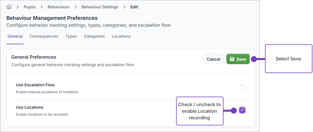 Check / uncheck Use Locations. When checked, you can select a location when recording a behaviour incident:
