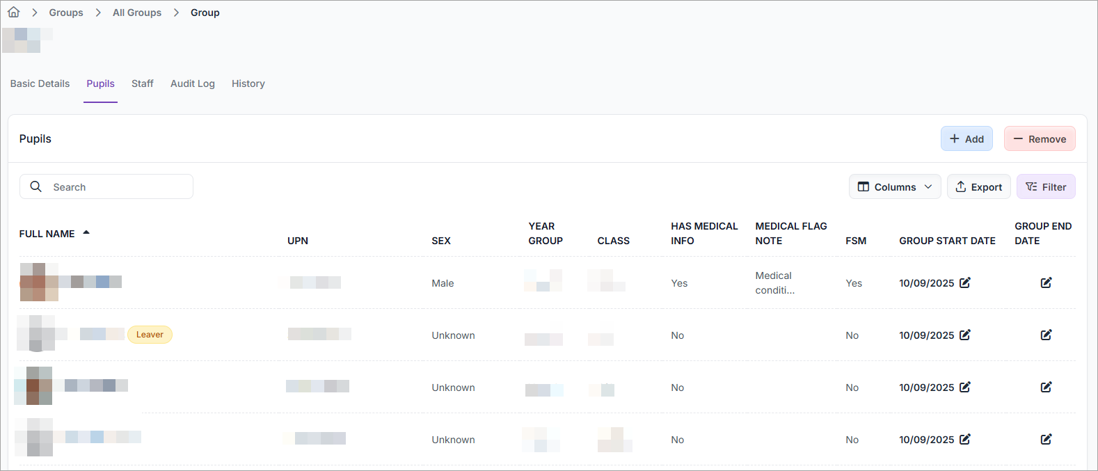 ) next to the Group Start Date for the specific pupil.