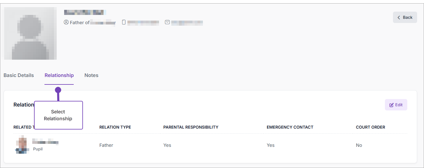- To edit a relationship, modify the Relation Type from the list and check Emergency Contact as required.