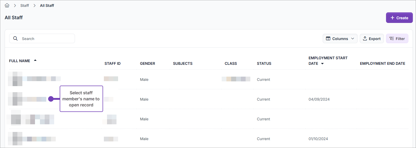 - Find the member of staff whose contact details you want to edit (use the search bar or filters to speed up this process as appropriate):