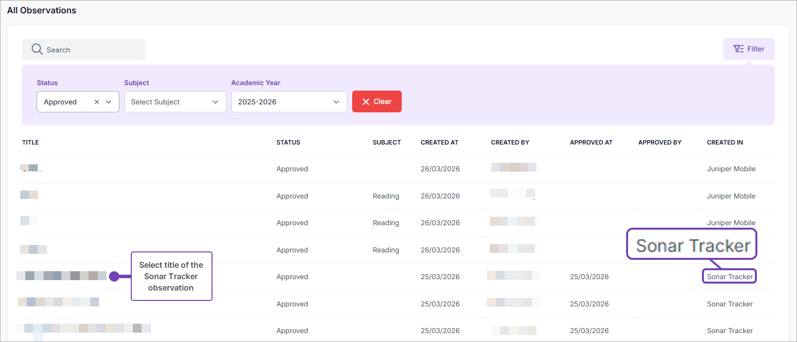 - Locate the observation that you want to delete using search or the status filter (set to Approved) as needed.